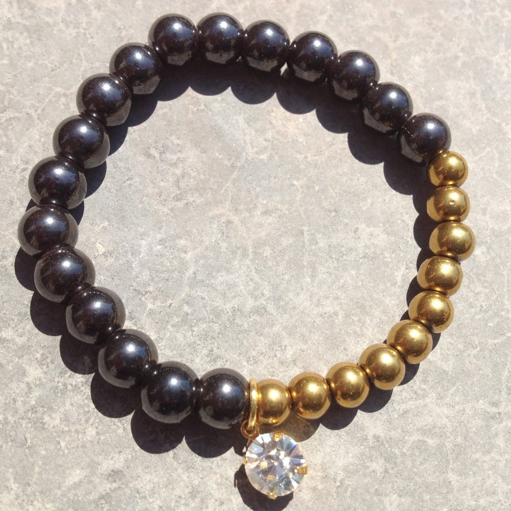 A beautiful ying and yang of blackish magnetic and gold beads.